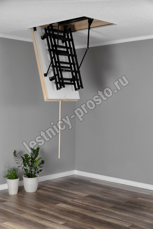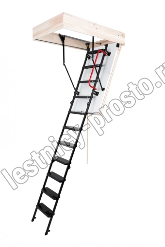 Лестница складная трехсекционная. Рабочая поверхность полностью выполнена из металла и покрашена порошковой краской. Термоизоляционная крышка типа "сэндвич", толщиной 86 мм, утеплена пенопластом, облицована с двух сторон ДCП белого цвета.