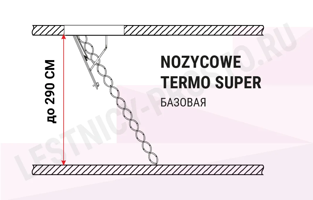Модель лестницы, благодаря использованию цельнометаллической ножничной конструкции, идеально подходит для установки в помещениях высотой до 290 см. Выбор лестницы NOZYCOWE TERMO SUPER - это инвестиция, которая позволяет минимизировать потери теплого воздуха и значительно снизить расходы на отопление.
