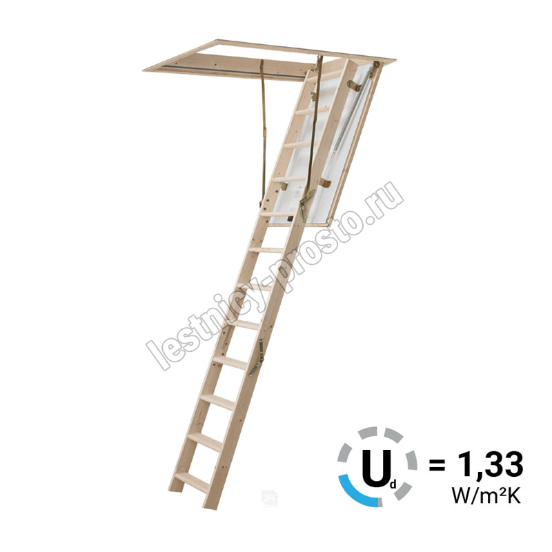 В комплекте: люк из сэндвич-панели, пружинный механизм "короб-люк", короб, трехсекционная лестница с сосновыми ступенями, замок люка, штанга для раскладывания лестницы.