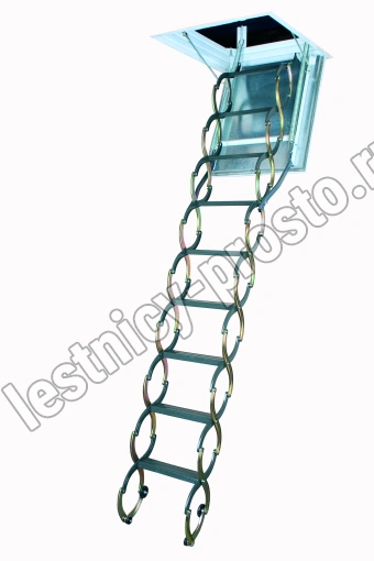 Благодаря «ножничной» системе складывания в сложенном виде лестница LSF очень компактна, и соответственно имеет небольшой размер крышки люка. Специальный механизм регулировки угла открывания крышки люка позволяет подогнать высоту лестницы под высоту потолка.