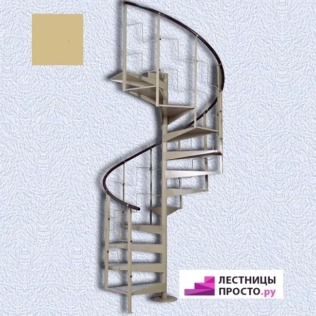 Ступени лестницы изготовлены из бука по технологии MULTIPLEX и покрыты износостойким защитным лаком. Лестница монтируется как по часовой стрелке, так и против. Возможен монтаж в круглый или квадратный проём. Ограждение: стальные трубки, Ø25 мм RAL 9006. Поручень: гибкий цельный ПВХ-поручень Ø40 мм серого цвета. Конструкция и балюстрада окрашены порошковым способом в серый цвет (RAL 9006).